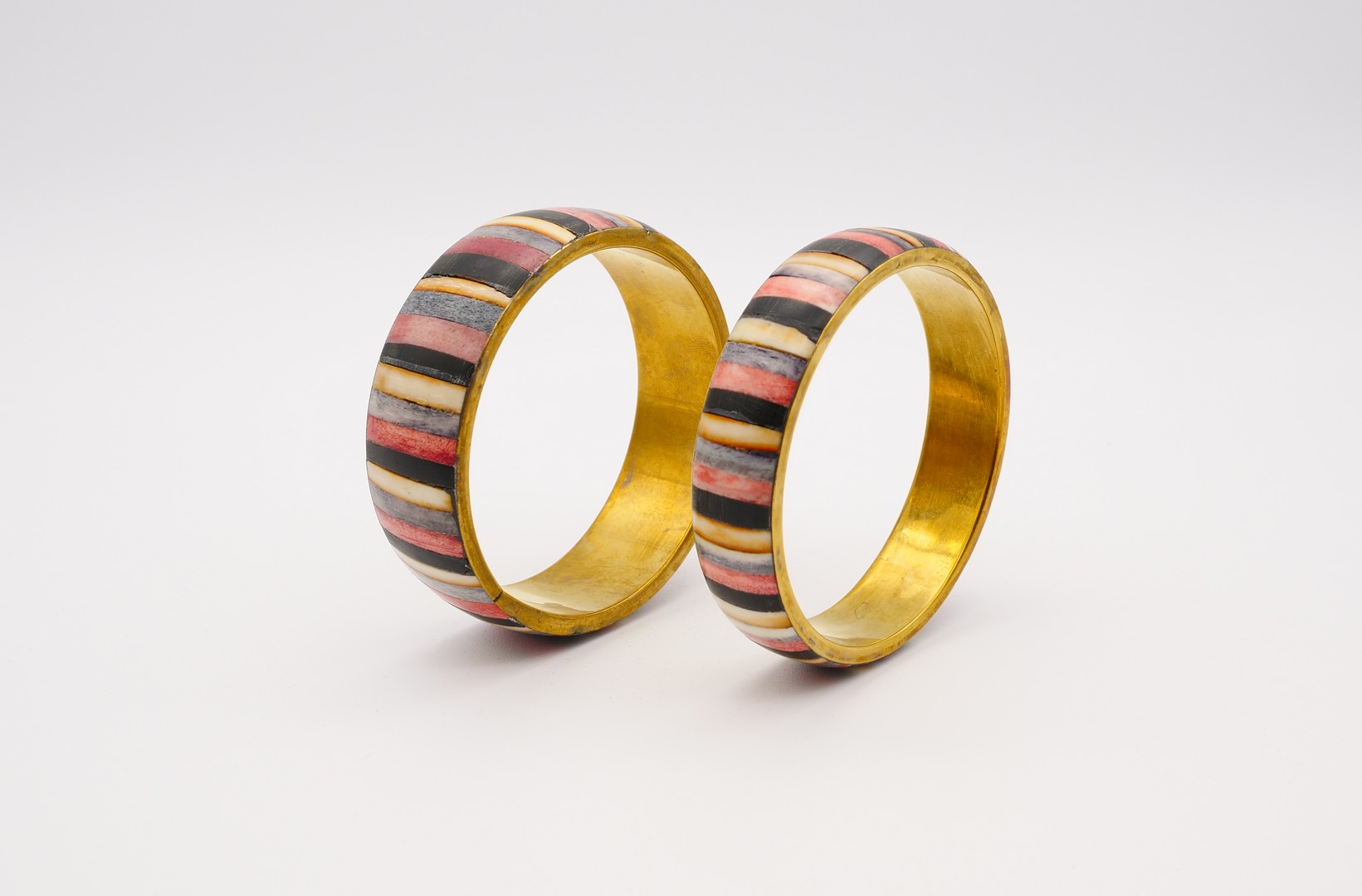 Two Ethnic Tribal brass bangle bracelets inlaid with nice 4 colors (red, grey, white and black) small piece of bone. In great vintage condition. Vintage 1980s. That kind of bracelets usually made in India.