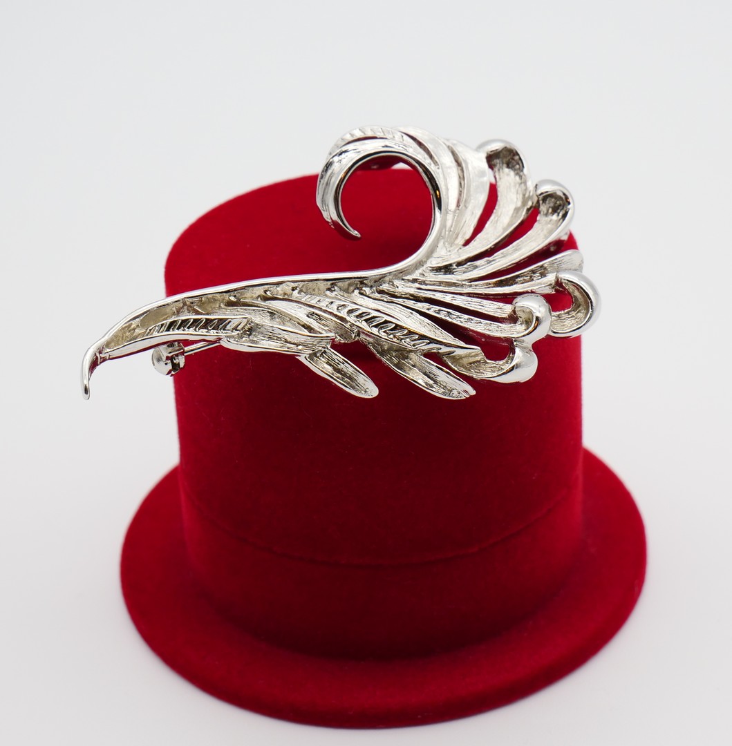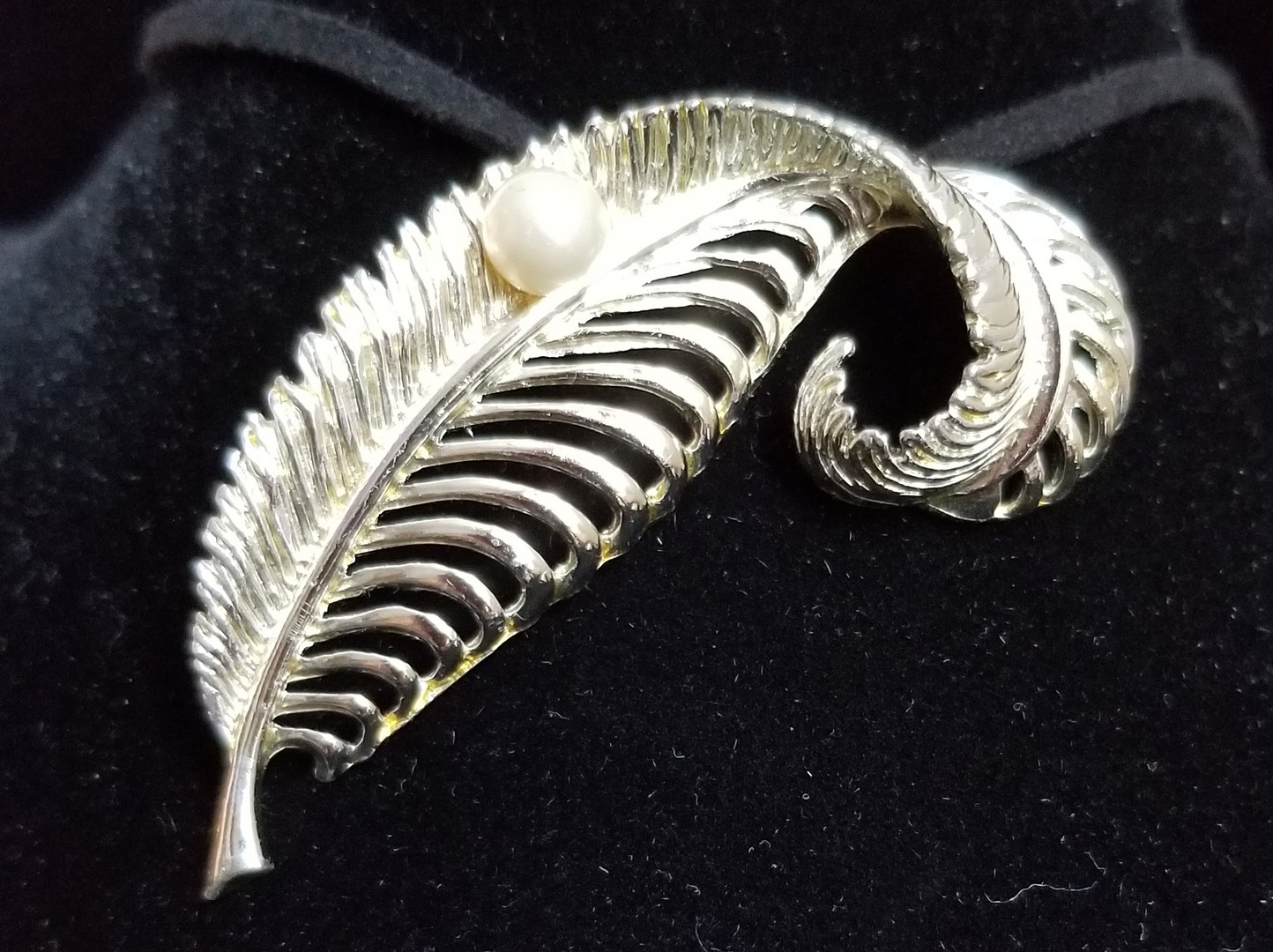 Brooch, Feather with pearl, silver tone metal. Brooch for poets and romantics, evokes a lyrical mood. In excellent condition both metal and pearl. Signed in italics "Artistic".