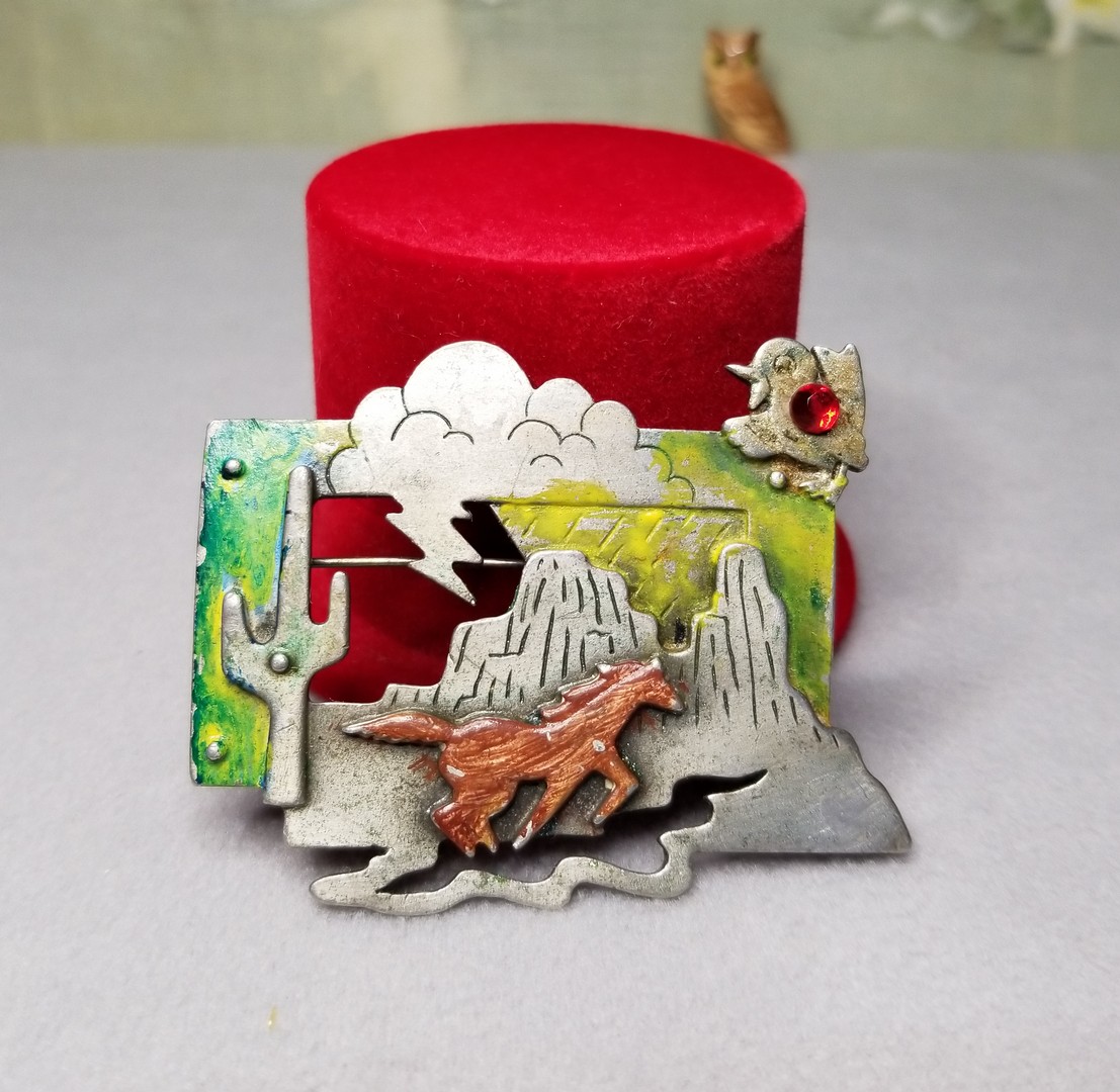 Rare, Beautiful signed JJ Jonette Jewelry original - signed JJ©. This is a very cool Native American scene, Santa Fe Line - colors are the brown, green and yellow with the cool pewter grey/silver. No damage - item is in great condition!
