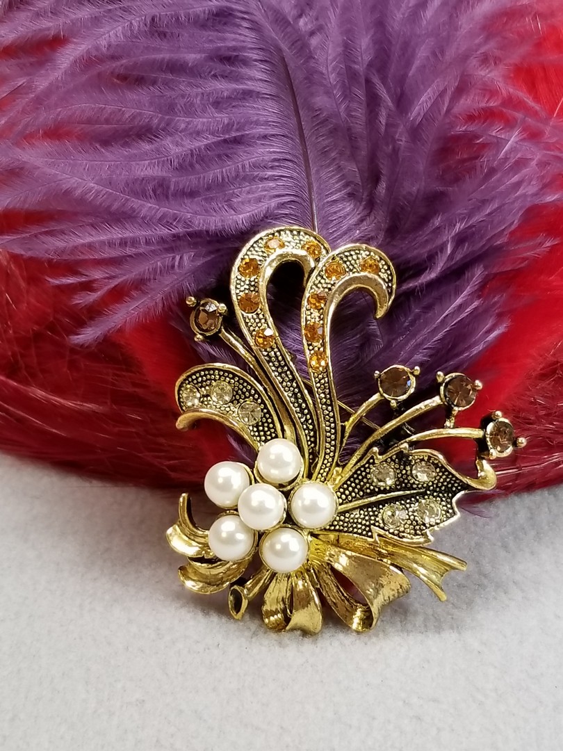 Stunning Faux Pearl Flower brooch featuring with Topaz, Citrine and Clear Rhinestones in bouquet shape tithed with ribbon. Brooch made in antiqued gold tone metal. The Rhinestones are very sparkling. In good vintage condition