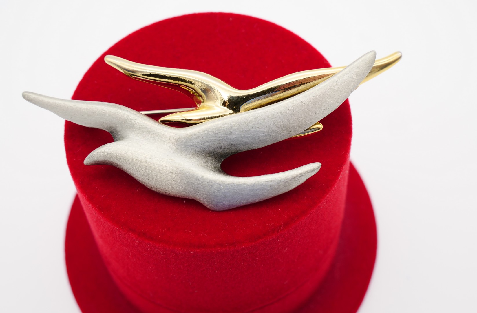 Delightful pewter brooch featuring two geese in love. Signed Diane Fafard FAF® in cursive small letter. Diane Fafard is a Montreal designer who was a finalist in the 1997 Quebec Golden Designer Jewelry Award. The fine quality pewter and 18k gold plate were used in her designs.