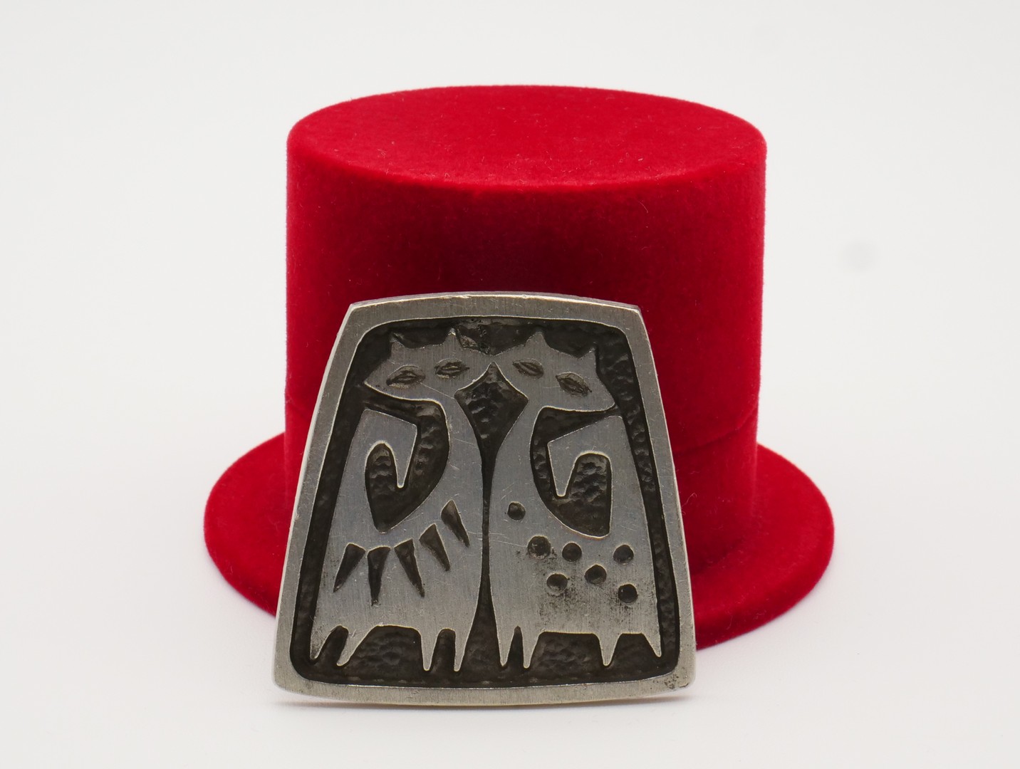 Very pretty two cats. Vintage Swedish retro 1960s pewter brooch, signed TENN SWEDEN. Original silver pin clasp. (Tenn is a Swedish mark for pewter). This mid-century modern brooch is rectangular in shape made from pewter. In good vintage condition