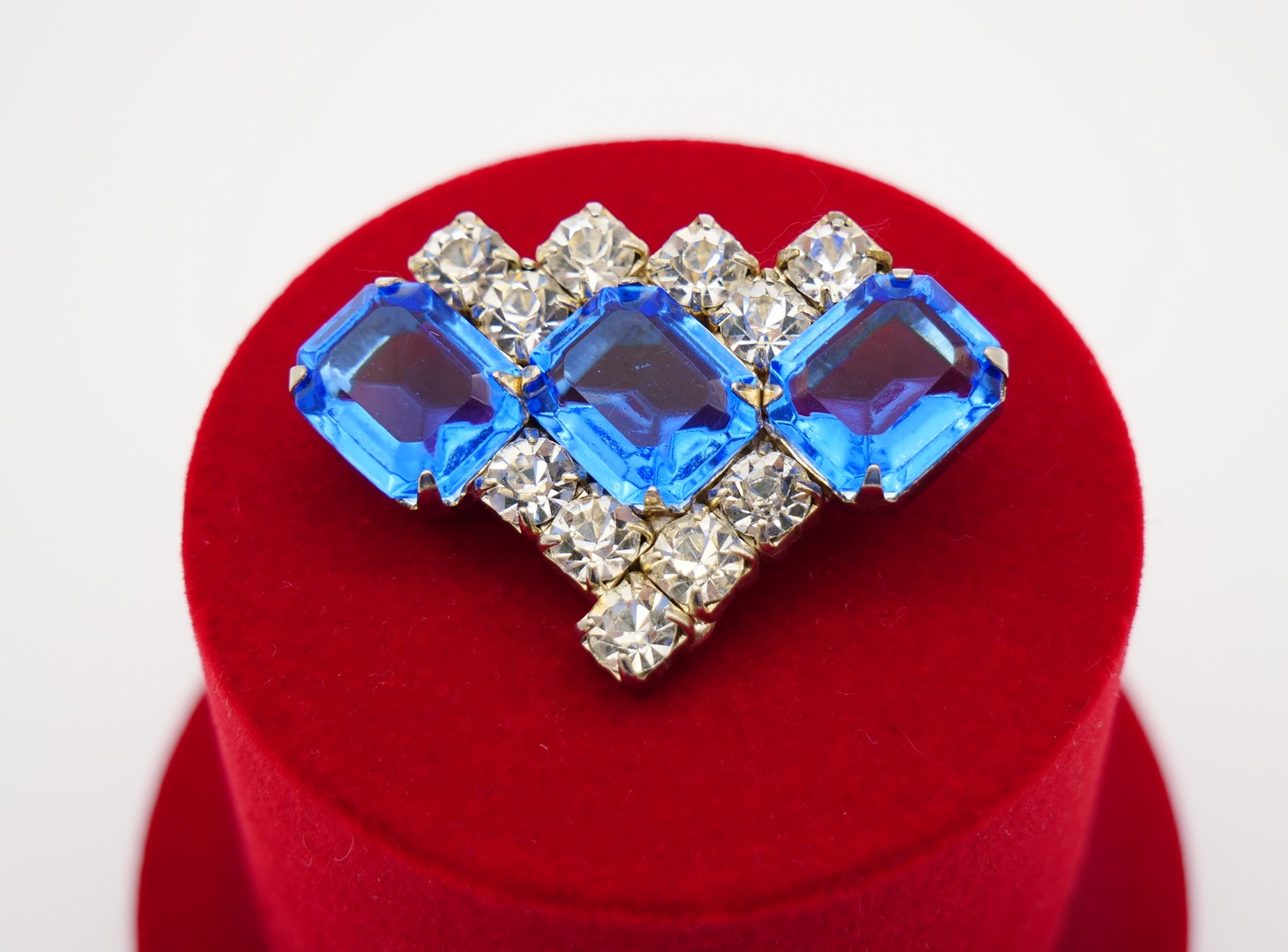 Gorgeous statement brooch! Three big faux Blue Topaz and Clear Sparkling Rhinestone in three angle shape. Silver Plated Brooch Pin in Art Deco style. Clasp works well. The brooch is in great vintage condition. Not signed