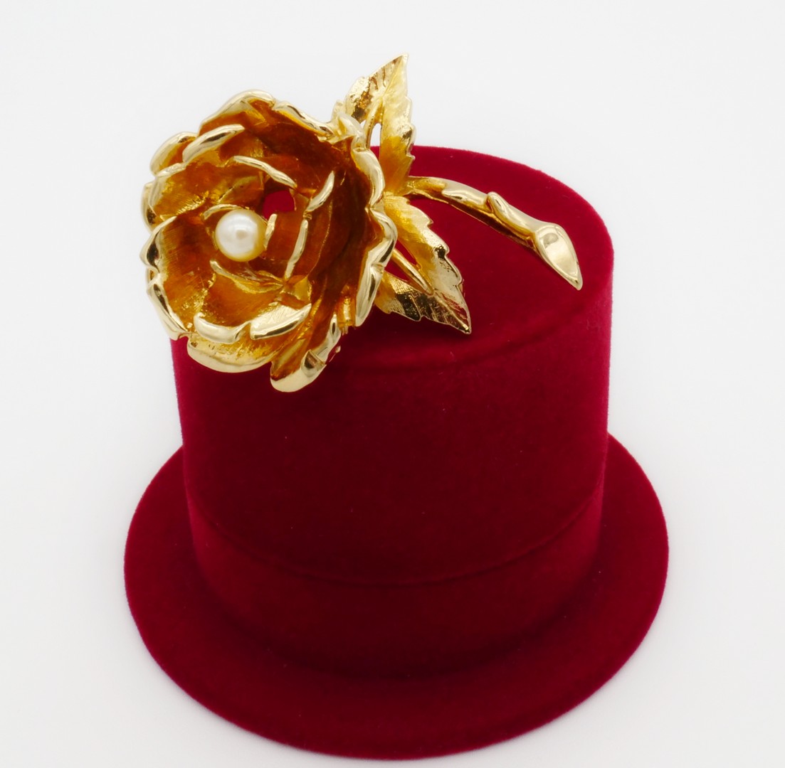 Beautiful vintage single flower brooch with gold bud featuring an 18k gold plate. Signed KASS CANADA.