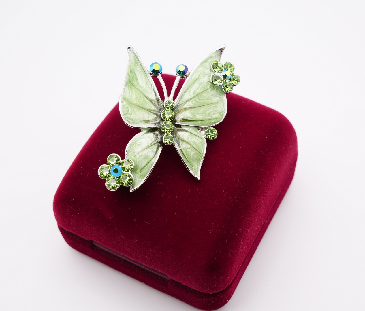 Delicate Light Green Enamel Butterfly Brooch with two flowers decorated with green Rhinestones. In excellent condition. Vintage 1970s. Bohemian Style.