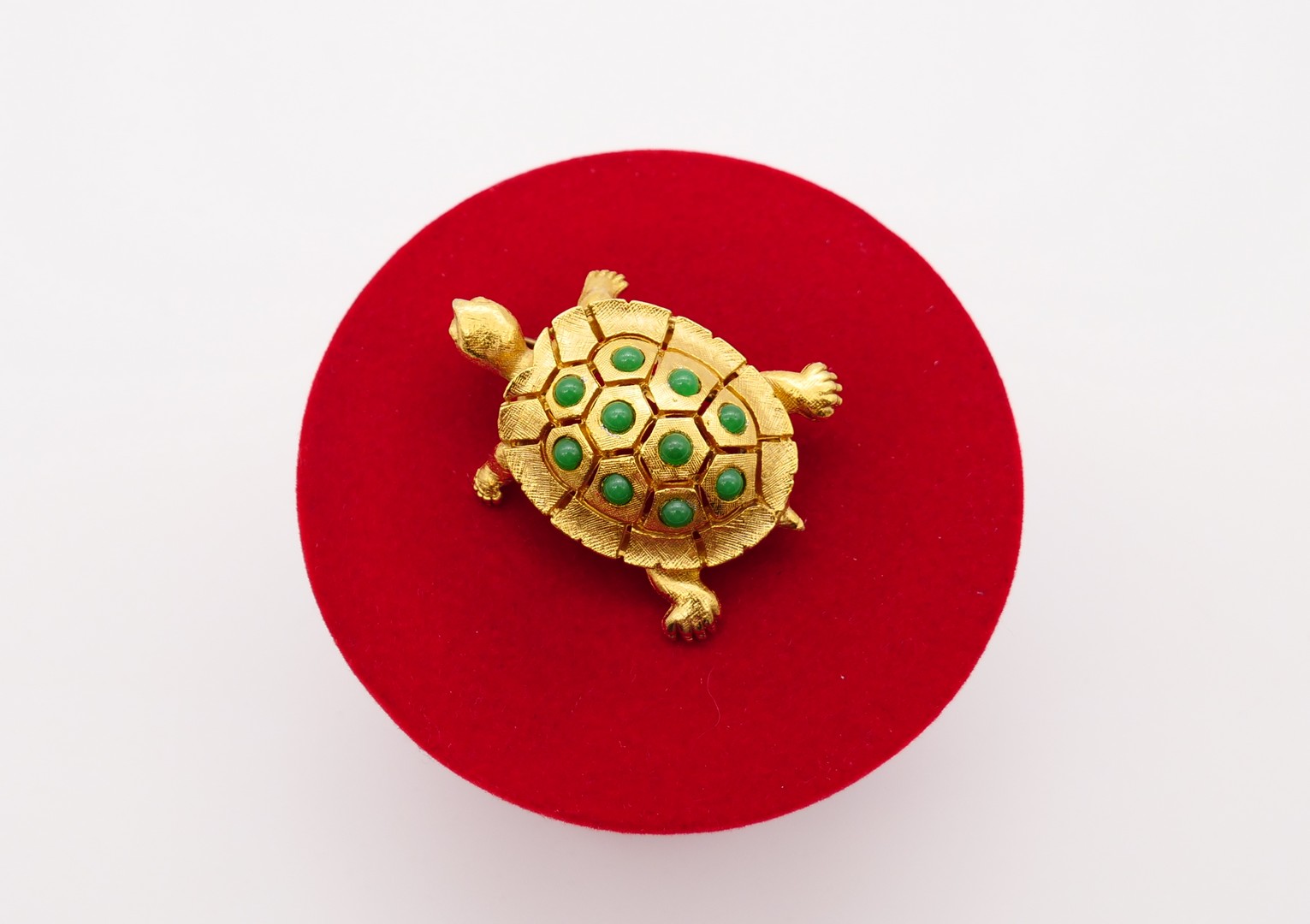 Very attractive Turtle brooch by Sphinx in Brushed Gold-Plated Metal. The carapace is decorated with green glass seed cabochons. The brooch is marked by number A1034. Usually Sphinx jewelry marked by a serial number of 4/5 of numerical figures and letters or "SPHINX" in an oval cartouche. Vintage 1970s. The hinge is little bit deformed but works very well. Made in England. In good vintage condition.