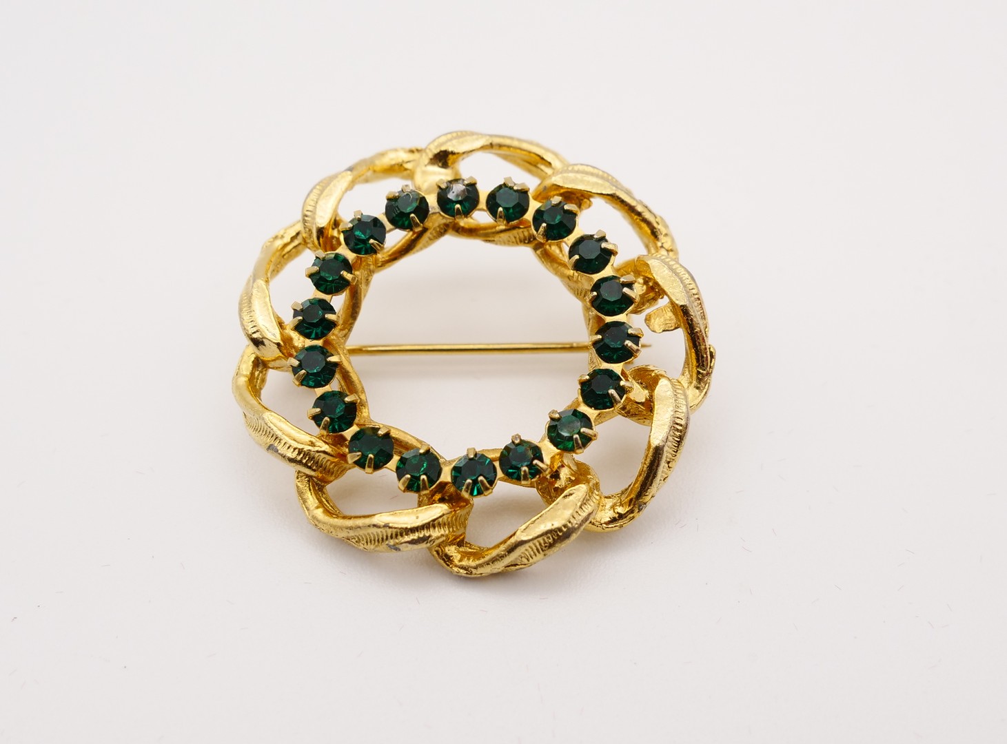 Very elegant ring wreath brooch with deep green color rhinestones. The brooch is in gold tone textured metal. In great condition. Vintage 1960s.