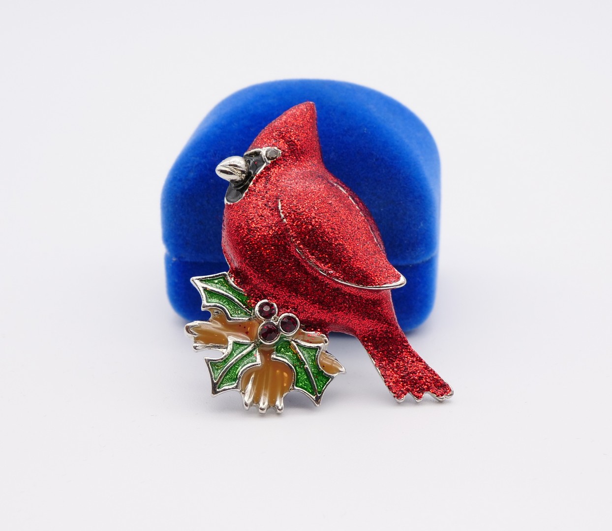Beautiful Shimmery red enamel Cardinal holding green and gold holly leaves accented by red rhinestones as holly berries. Clasp and pin are in good working order. Perfect for Christmas and all Holiday season. In great vintage condition.