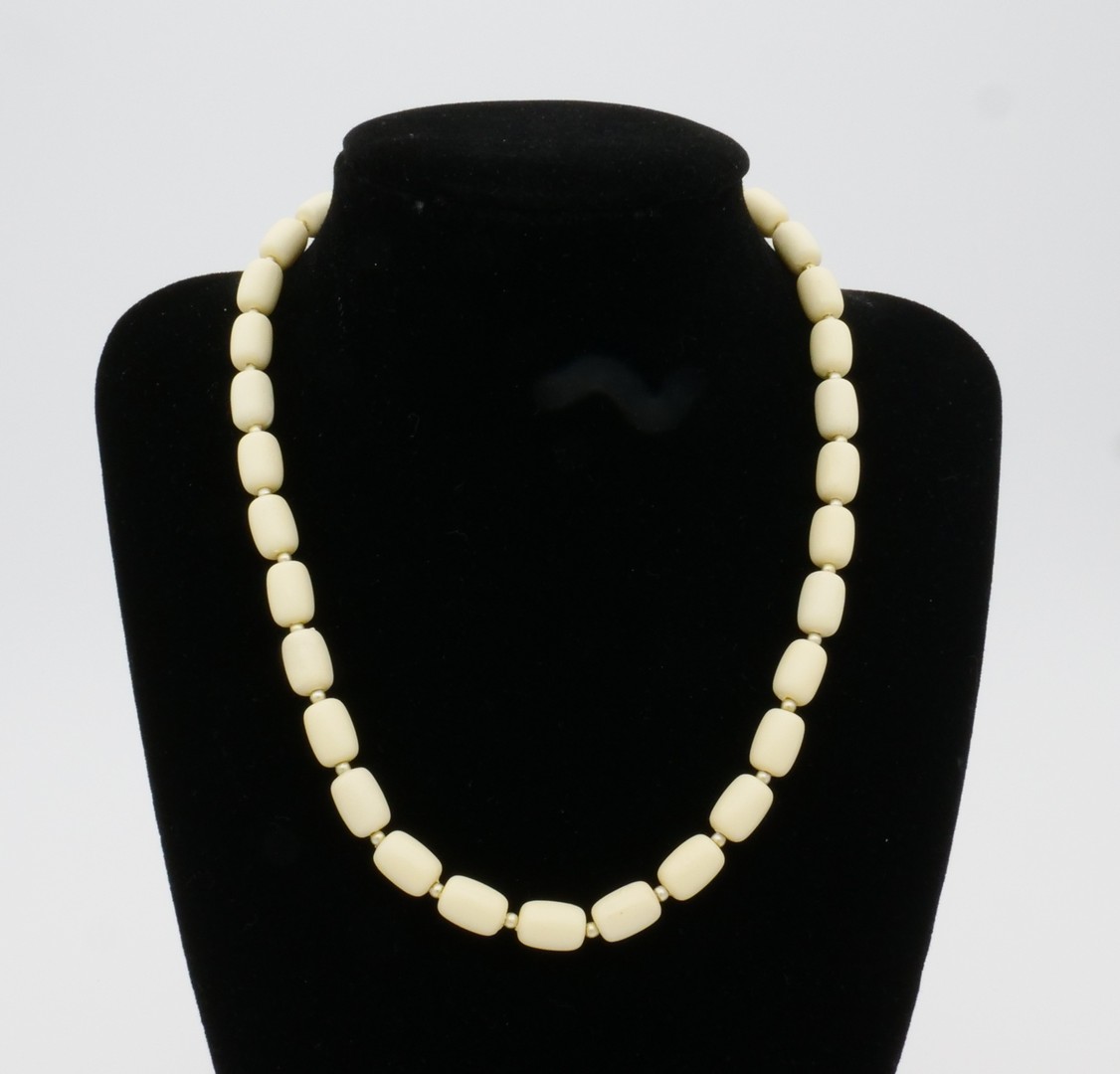 This is a very elegant necklace with ivory enameled beads and tiny silver color spacers. The Clasp is marked with patent 537985, which is associated with Marvella (although unsigned the patent number is attributed to Marvella). In great vintage condition.