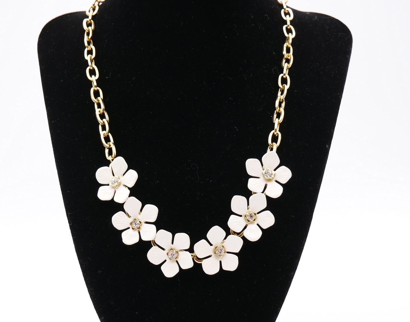 Beautiful necklace in Flower Power style or Hippie. Gold tone chain with six white enamel flowers with rhinestones in the centres. In excellent condition. Vintage 1980s.
