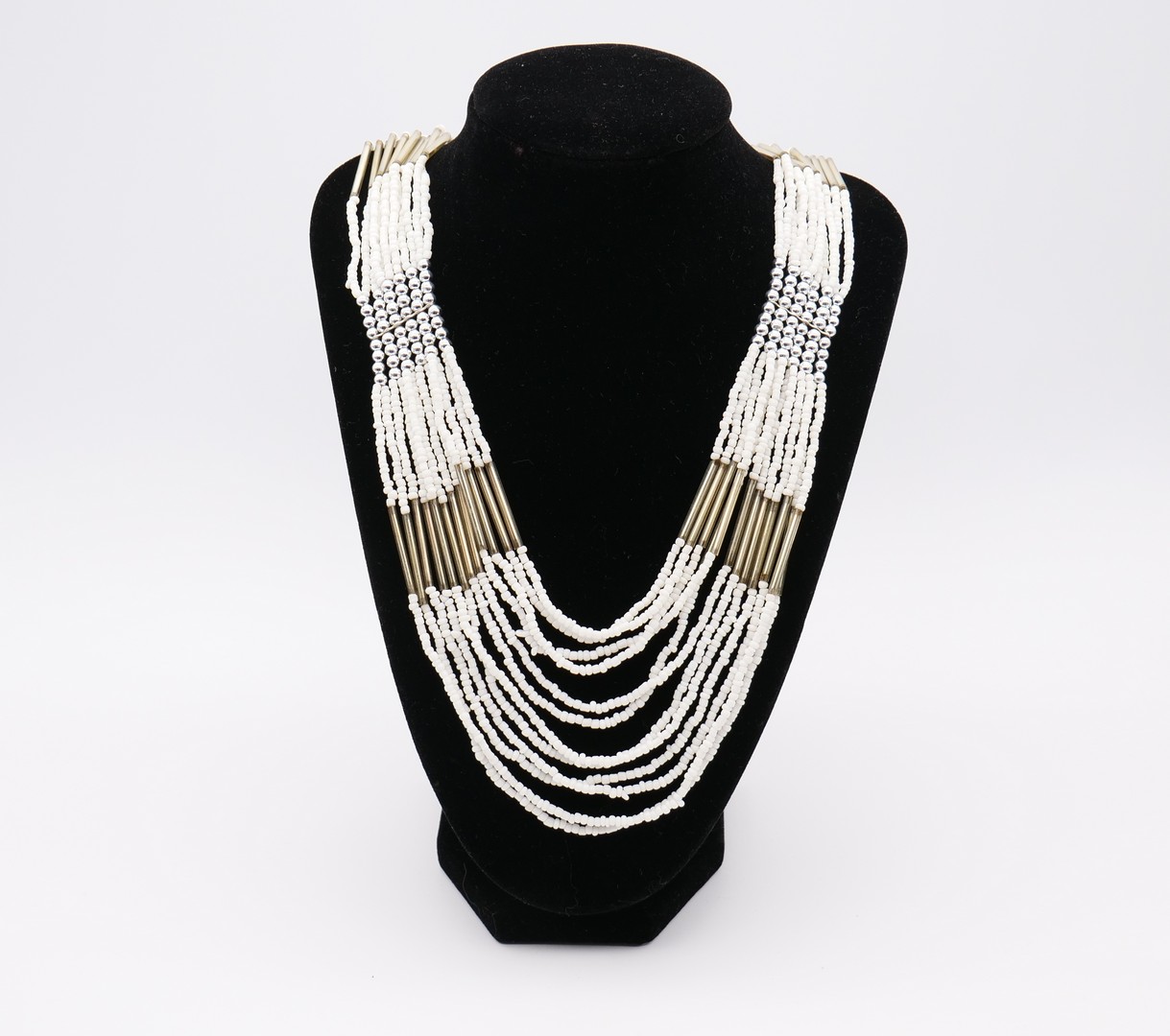 Classic Czechoslovakia Multi-Strand Necklace from white and silver glass seed beads and silver amalgamed bugle beads. In good vintage conditio