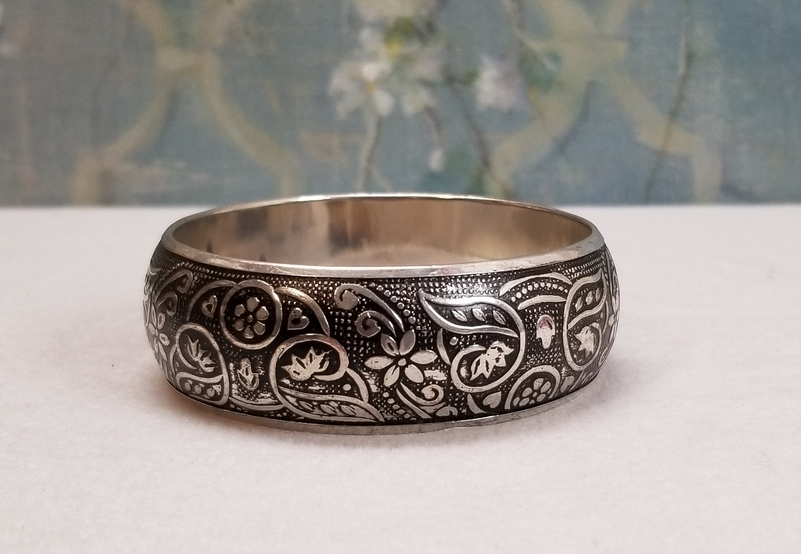 Ethnic Indian Vintage in retro style silver plated metal with embossed flower ornament bangle bracelet and with antiqued finish. In good vintage condition.