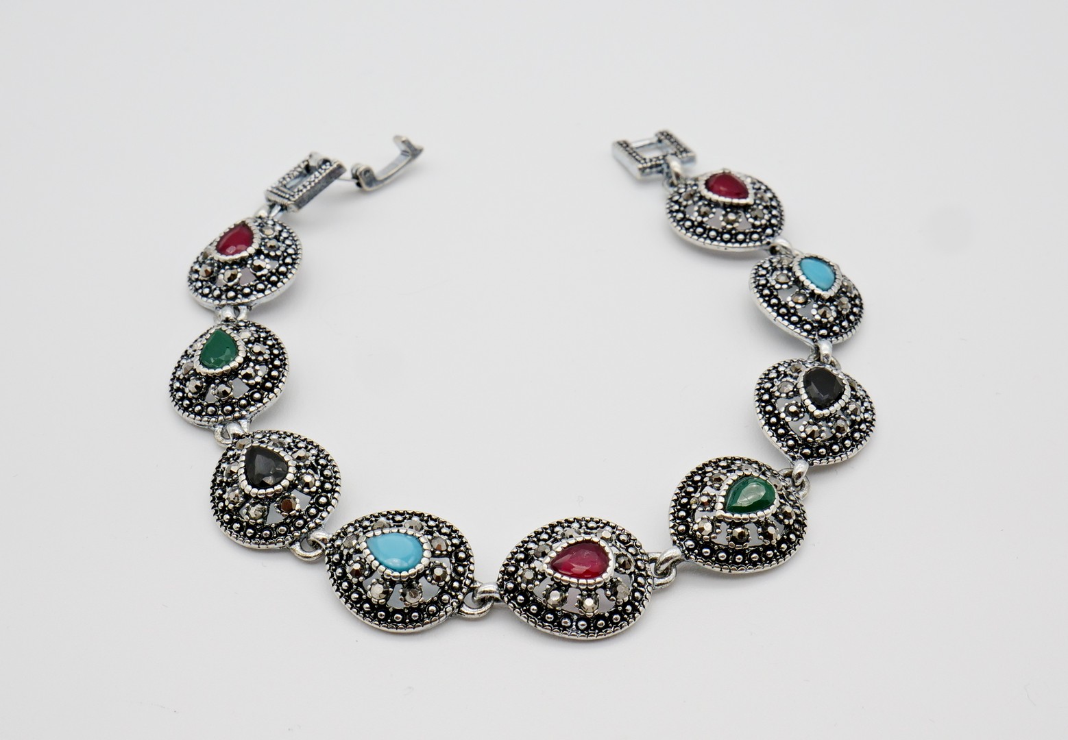 Beautiful vintage link bracelet. The bracelet features nine sections of brushed silver tone drop shape metal panels. Each section contains a faux stone cabochon such as turquoise, jade, ruby. The stones are surrounded by faux Marcasite. The bracelet has a fold over style clasp. This piece is unsigned but was well made. In excellent vintage condition.