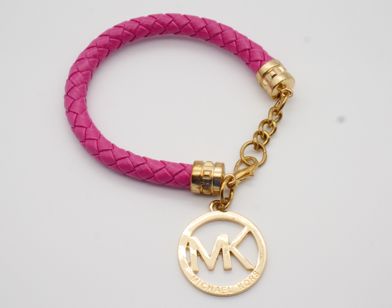 Michael Kors pink genuine braided leather bracelet with 18 K gold plated “Michael Kors” medallion-charm. Has a 3cm adjustable links. Very soft braided leather cord. In good condition. Signed Michael Kors.