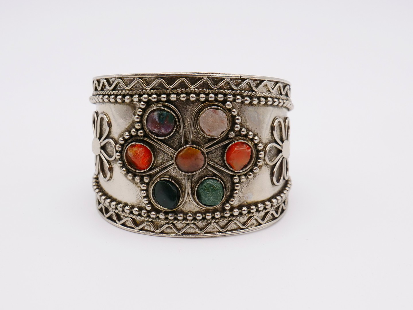 Vintage Tibetan or East Indian silver tone cuff bracelet with a variety of tumbled stones. The tumbled stones are green, orange, black and light pink. They appear to be genuine agates. The stones have a shiny appearance.