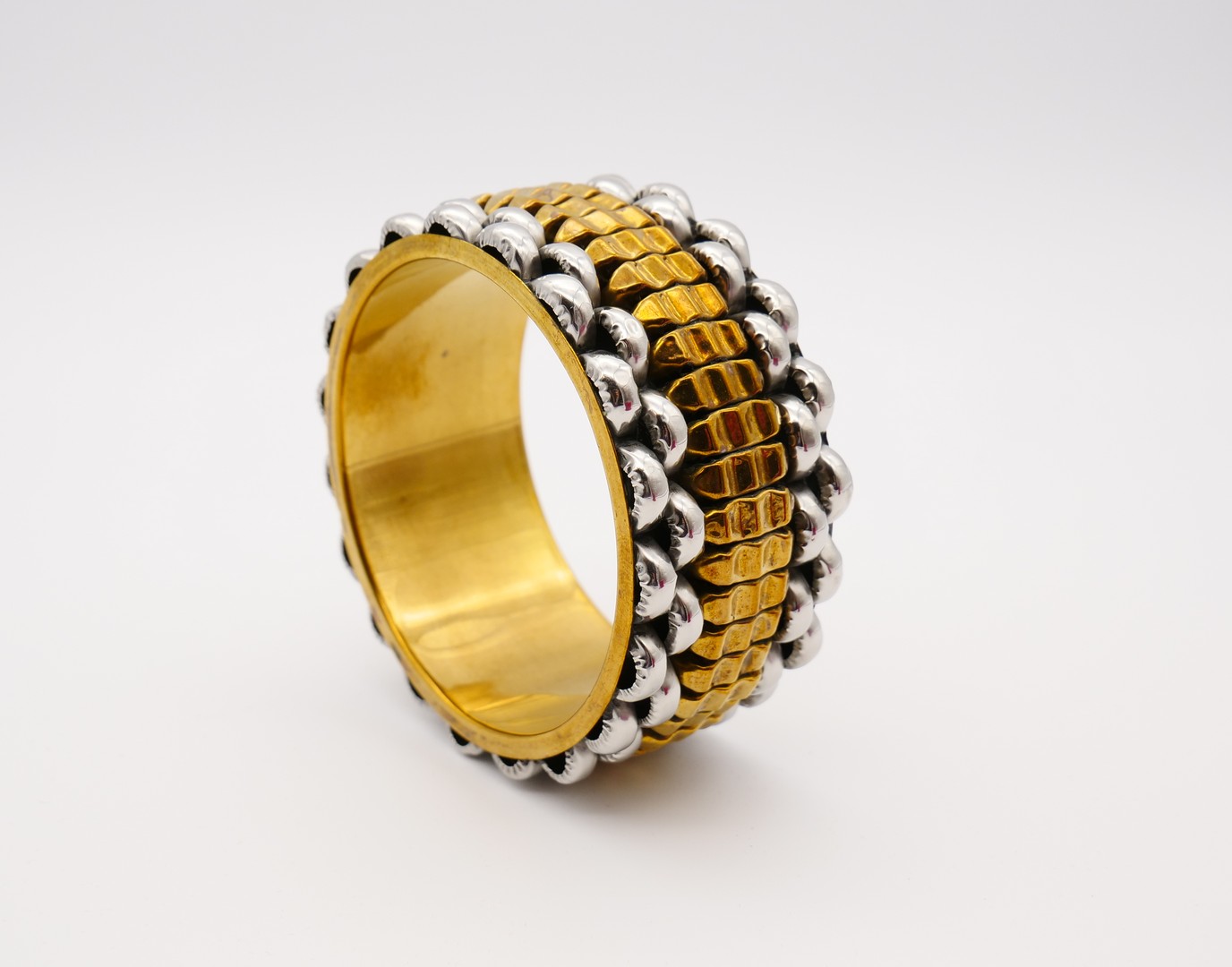 Eye-catching Egyptian Revival Style chunky costume bracelet. Design features textured shaped brass elements in the center and silver tone half spheres at the edges. Vintage 1980s.