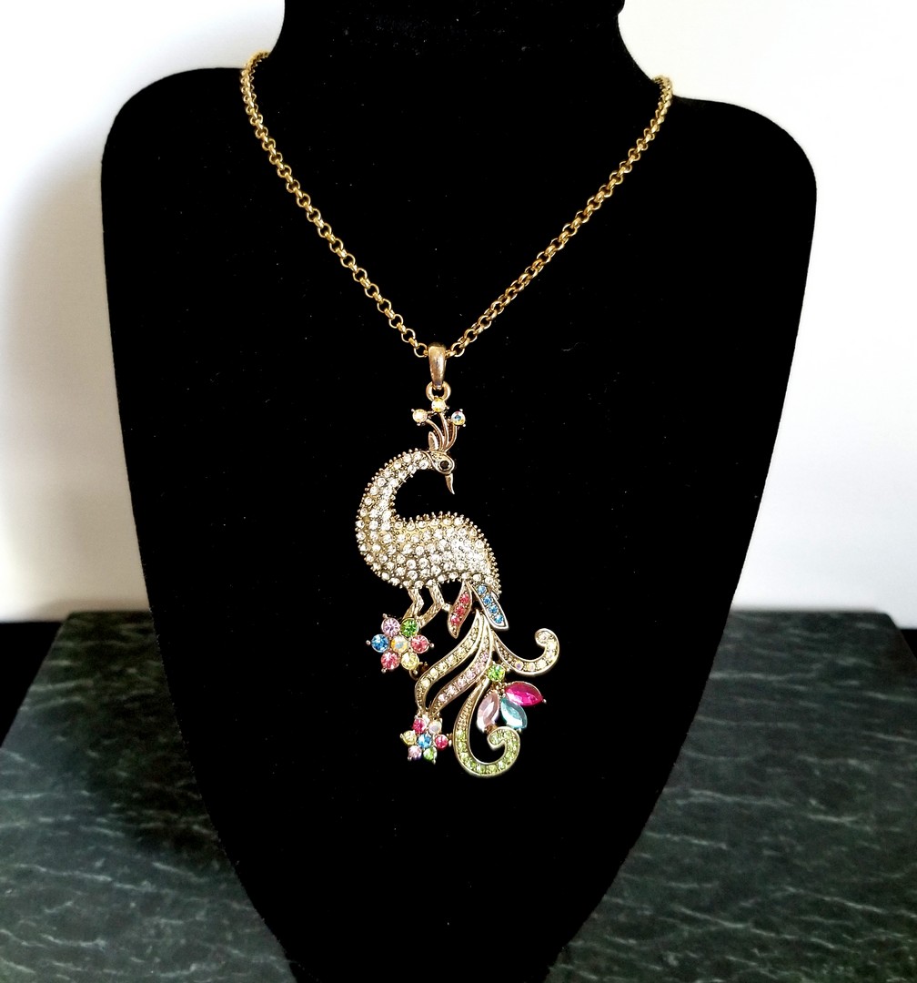 Beautiful Necklace with a stunning peacock pendant. The chain is in gold tone metal. Gold tone Peacock Pendant with clear, blue, green, pink rhinestones. The Peacock body is pave with clear rhinestones and beautiful tail has pink, blue, green and Aurora Borealis rhinestones. In Art Nouveau Style. In great condition.