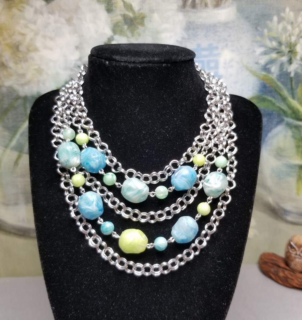 Beautiful Vintage CORO Choker Chain Necklace. Silver tone metal chain with Blue/Green Marble Lucite Beads, 5 strands.