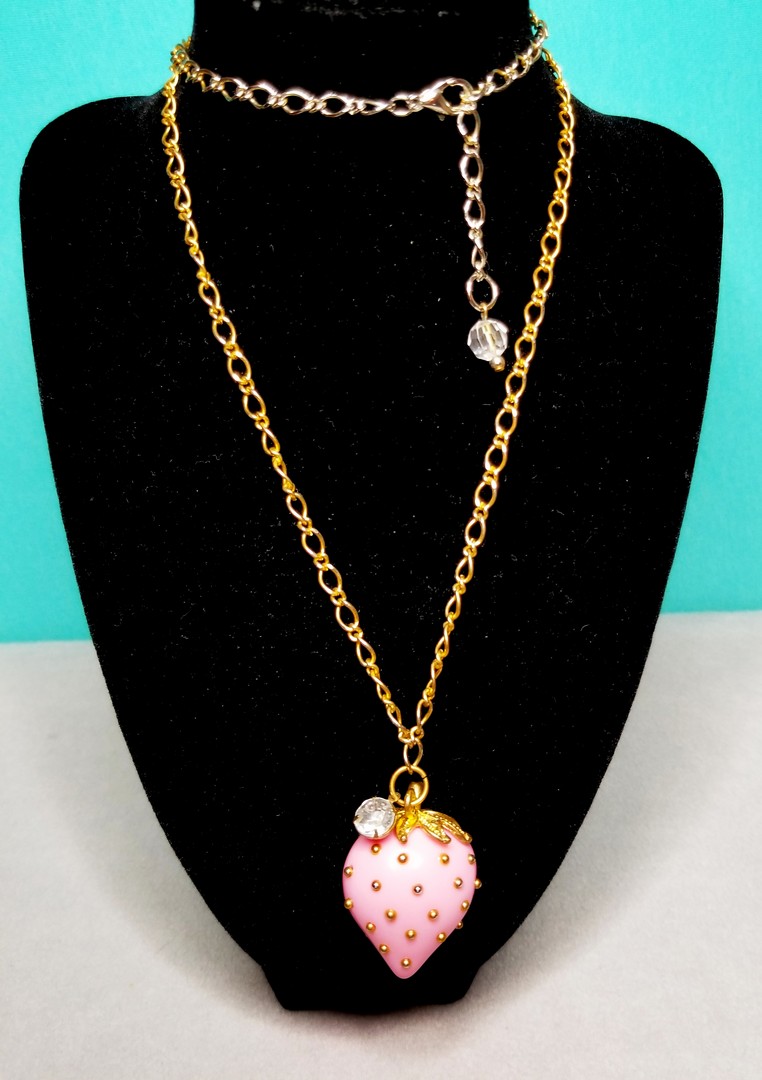 Pink strawberry pendant studded with gold strass and featured with clear rhinestone charm is very pretty. The chain is 72 cm long, it can be adjusted to any length. In great vintage condition. The similar strawberry necklace was designed by Kenneth Jay Lane for Avon.