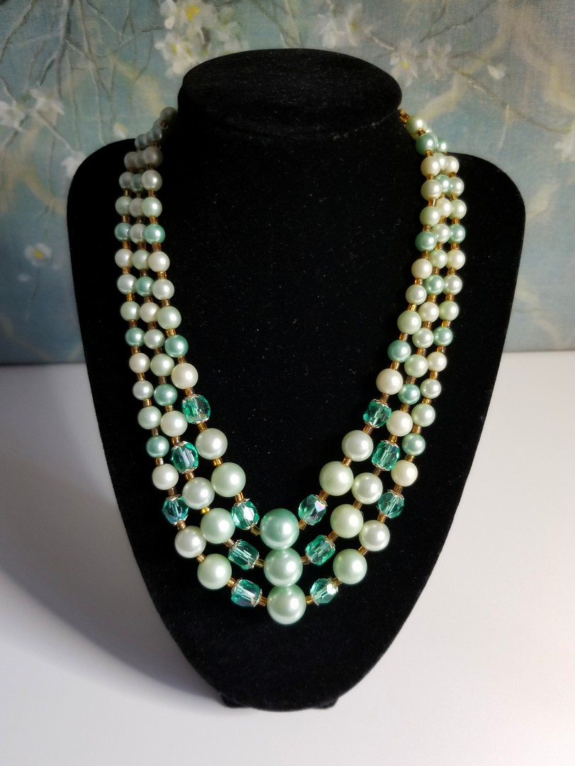 Delicate and elegant beautiful color combination vintage necklace. Graduated three-strand faux pearls with faceted crystals in light green colors. The necklace's clasp has a beautiful gold-tone setting. In excellent condition. The pearls have no sign of wear. Not signed but in classical Japanese design.