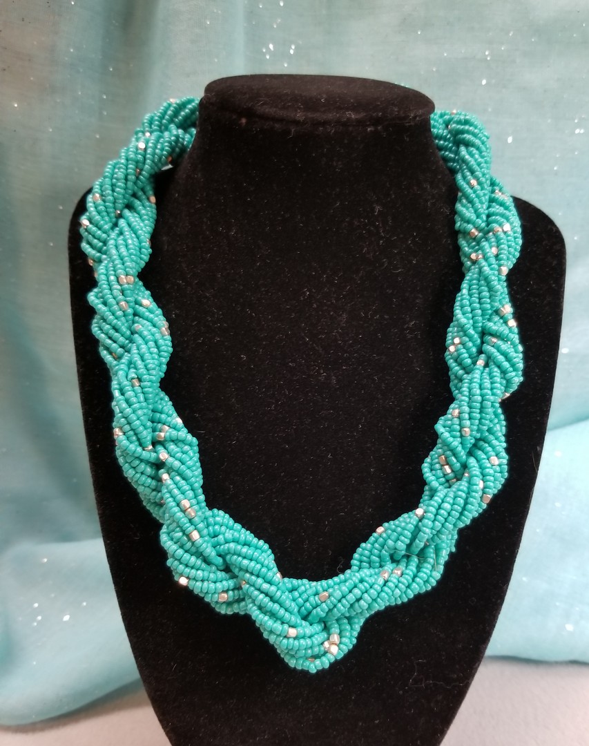 This turquoise and silver woven seed beads necklace is in good vintage condition. The necklace is 44 cm long and has an expansion chain. The necklace is approximately 2 cm wide. All the beads are glass and metal. Not Signed.