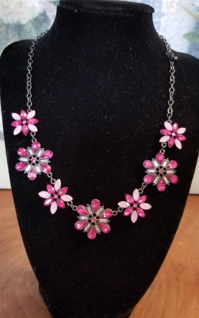 Beautiful choker necklace, gunmetal chain with Lucite Purple Drop and Marquise shaped Rhinestones, Lucite Opaque Pink Marquise Rhinestone and Lucite Clear Baguette Rhinestones. In excellent condition. Not marked. 44 cm length with extension chain. This necklace is made Victorian style.