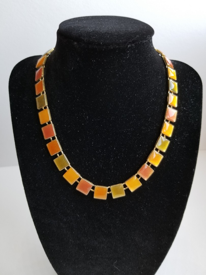 This is a beautiful gold tone link choker necklace with four color of enamel: yellow, dark brown, light brown and light green. Each gold square panel has colored enamel top which rotate colors between yellow, dark brown, light brown and light green. The necklace has a lobster clasp. Not Signed.
