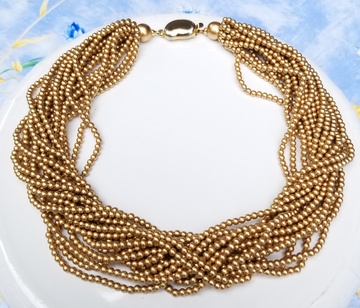 This is a beautiful, pearl beaded, choker necklace, made with matte, gold tone seed pearl beads. This necklace, measure’s 40 cm in length, and has a shiny, gold plated metal, bean shape box closure. On the closure signed Carolee without copyright symbol. In great vintage condition.