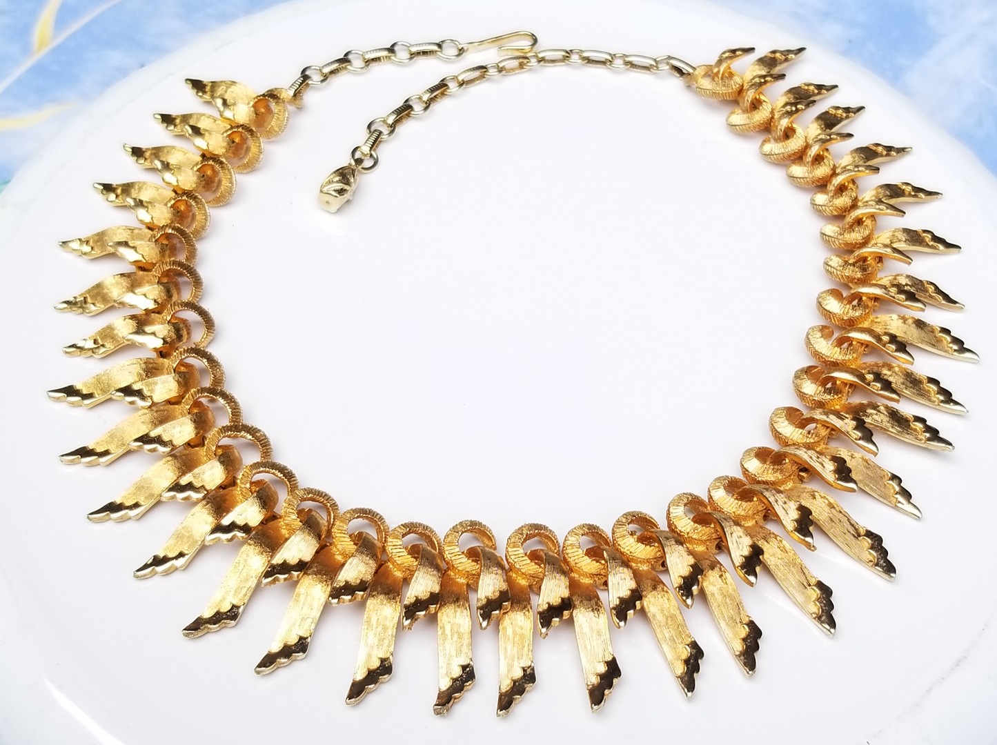 Gorgeous FRANCOIS Coro gold tone metal necklace. Each link of this necklace is composed of the loop from where textured gold metal ribbon with shiny gold details at their tip’s hangs. Signed Francois. The Francois (script) mark was used by CORO from 1937 to 1960 circa