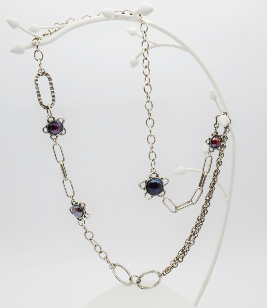 Pewter Chain Necklace with four glass flower elements. The centers of flowers are glass cabochon with Aurora Borealis effect. The necklace has three types of different chain design. Vintage, 1980s. Not signed. In good vintage condition.