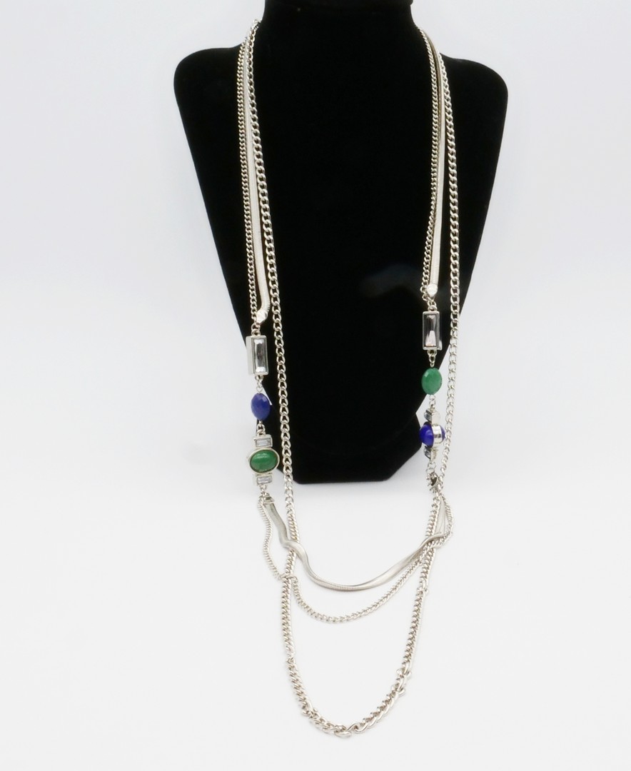 High quality gorgeous, three strands chain necklace, made with green, purple, and clear glass beads, cabochons and baguette crystals. Signed Mexx on the tag.