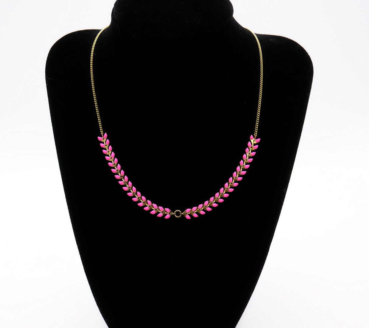 This delicate necklace is shaped like moving ear of wheat to fit closely with your neck. By French Designer 7Bis. Gold tone chain with Pink enameled ear of wheat. |